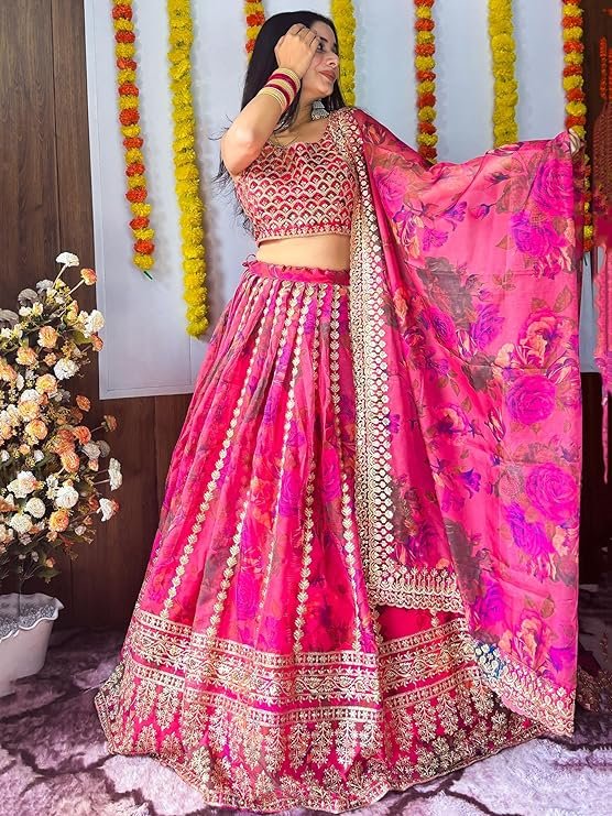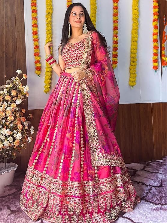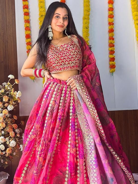 AG Clothing Women’s Organza Semi Stitched Lehenga Choli With Dupatta | Floral Digital Print With Sequin Embroidery Pattern | Traditional, Wedding, Ethnic Wear Lehenga (ZC-7072-Pink)