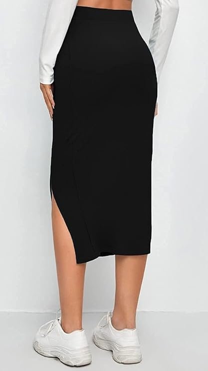 ALYNE Women’s Elastic Waist Pencil Bodycon Midi Skirt – High Waisted with Side Slit Below Knee Length Elegance for Women