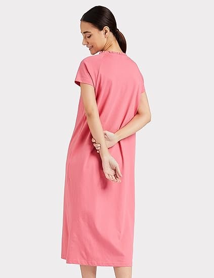 PRODUCT DETAILS: Calf-length, regular fit nighty featuring ruffle detail at neck