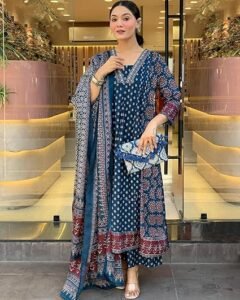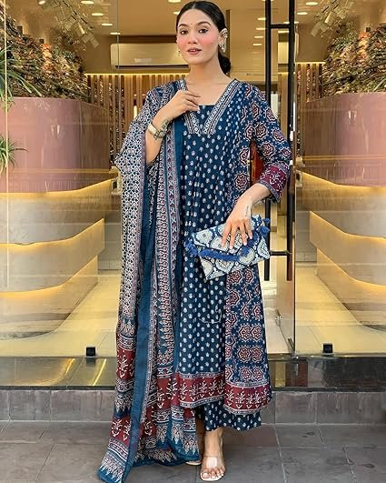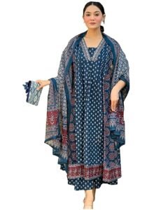- · 👗 Complete 3-Piece Set – Includes Anarkali-style kurta, matching pant, and pure cotton dupatta – a complete cotton suits for women with dupatta option for special occasions and casual outings.