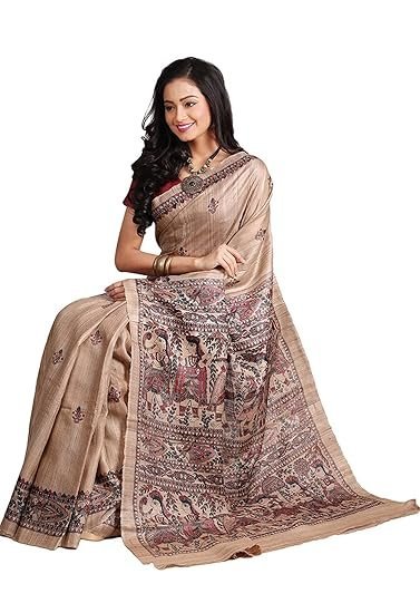 RACHBAI Womens Tussar Ghicha Madhubani Printed Pure Silk Saree