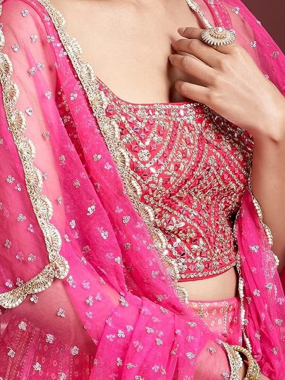 - Lehenga Work: Digital Position Print and Heavy Embroidery with Zari Embroidery ; Blouse Work: Dori, Zari & Sequins Embroidery with Real Mirror Work; Dupatta Work: Sequins Embroidery with Pearl Lace